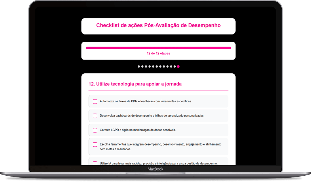 A um checklist com boas práticas para transformar desenvolvimento em resultados, com um passo a passo completo de ações para o pós Avaliação de Desempenho, incluindo: