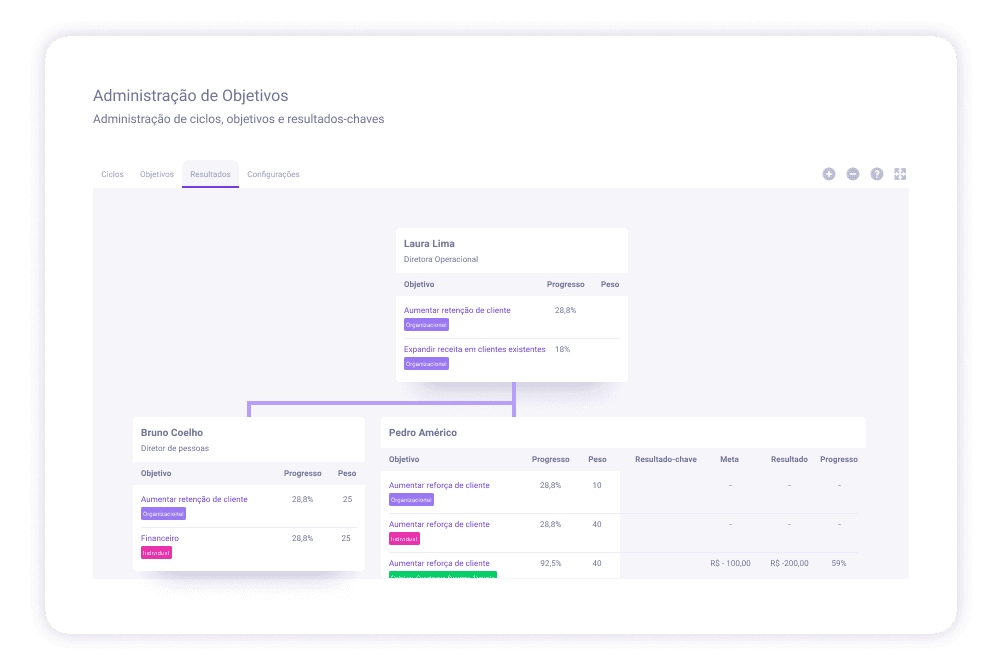 Adeque o sistema às necessidades da sua empresa! É tudo do seu jeito: pesos, permissões, visibilidades, regras, aprovações, períodos, tipos de metas e muito mais