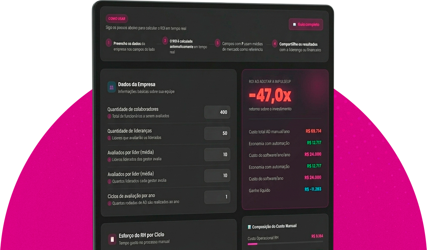 Descubra quanto sua empresa perde por ano com processos manuais de avaliação e quanto pode economizar ao automatizá-los. Resultados em tempo real, baseados nos dados da sua equipe.