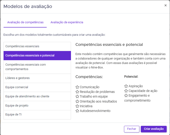 Para a utilização da Matriz Nine Box, a avaliação de desempenho precisa ter duas seções, por isso sugerimos uma avaliação de desempenho por competência e potencial. Assim, no nosso modelo você encontra exemplos de competências, podendo retirar as que não fazem sentido para a sua empresa e também adicionar novas.