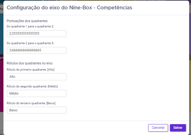 Na plataforma da Impulseup, você também pode personalizar as variáveis dos eixos, ou seja, você não estará restrito à tomar uma decisão apenas com base no potencial e no desempenho; alterar os parâmetros, então você é capaz de mudar a pontuação de cada nível conforme a realidade da sua empresa; além de ser possível personalizar a cor e o nome dos quadrantes de acordo com sua identidade visual e a linguagem utilizada na organização.