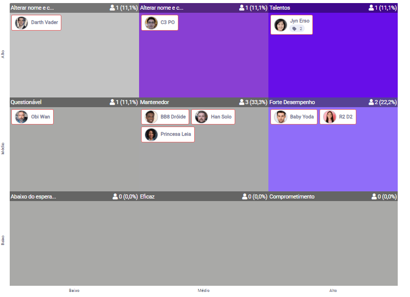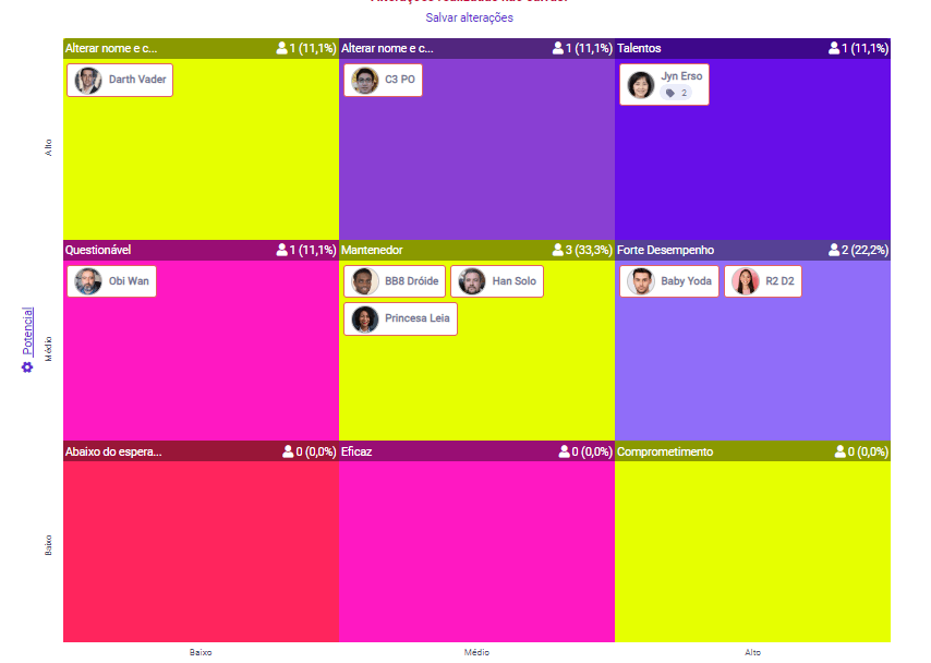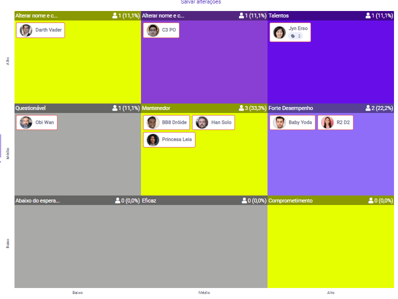Para realizar a calibragem é simples! Basta clicar e arrastar o nome do funcionário para o novo quadrante ajustando às pontuações de cada eixo que também são editáveis.